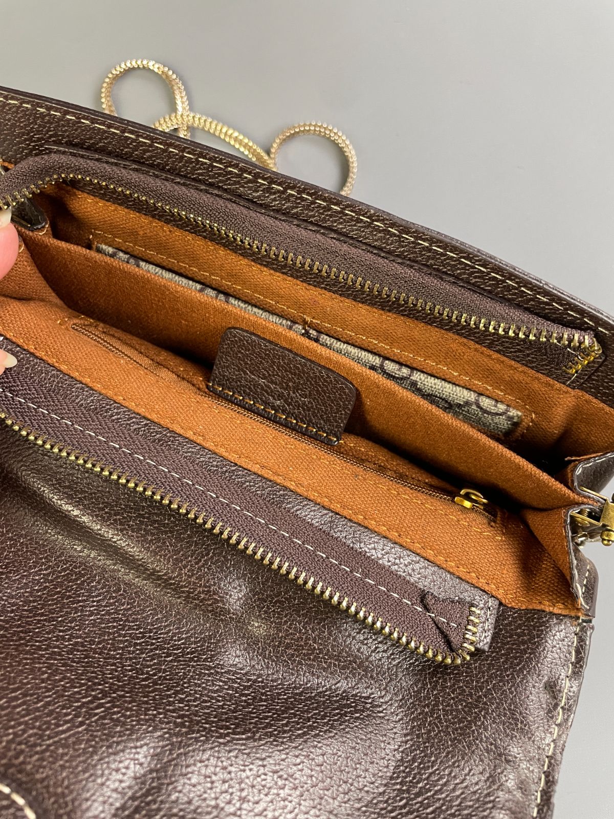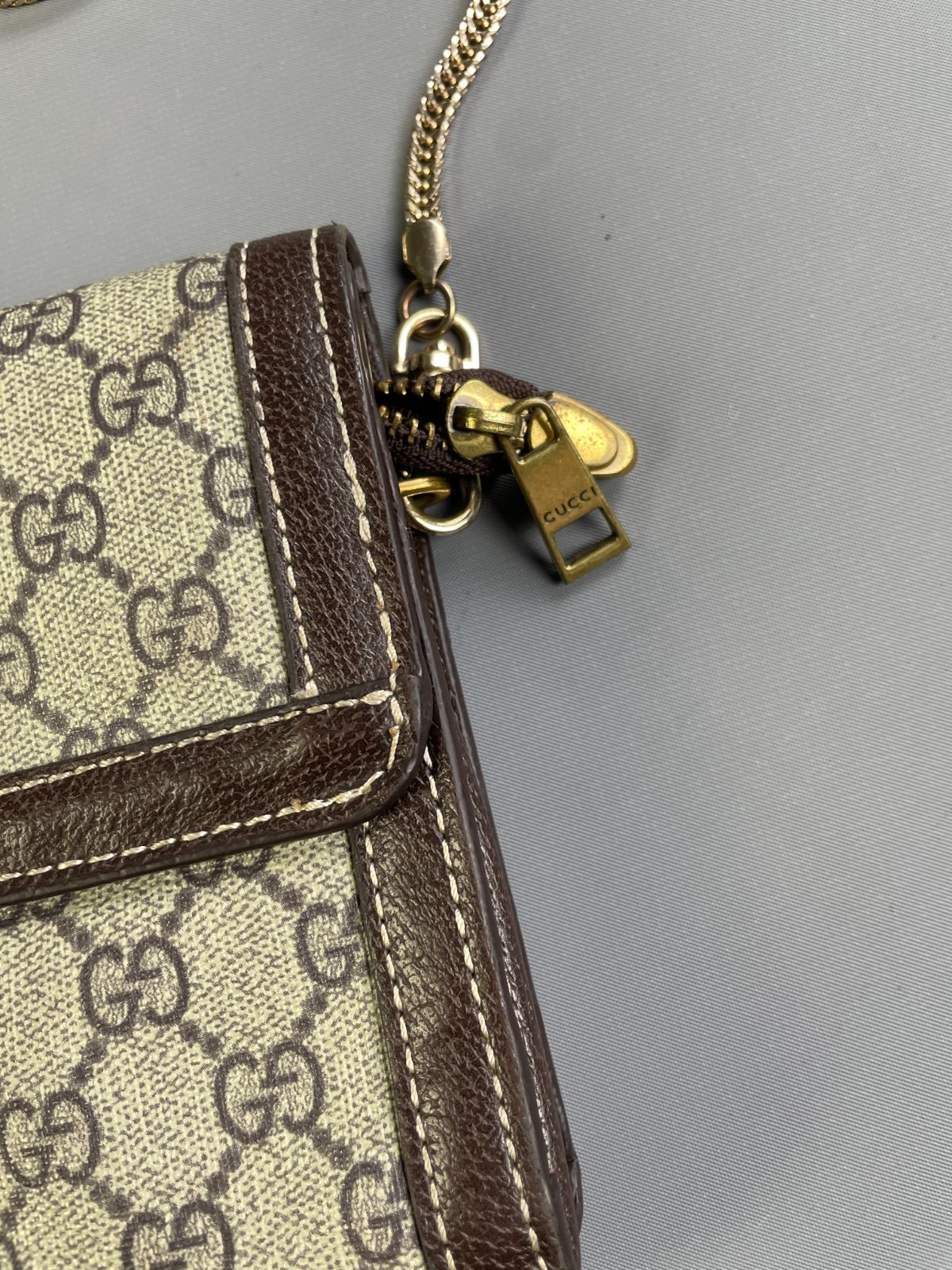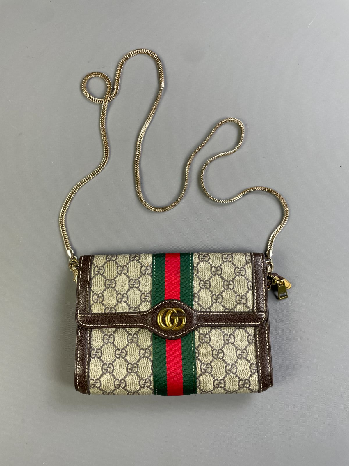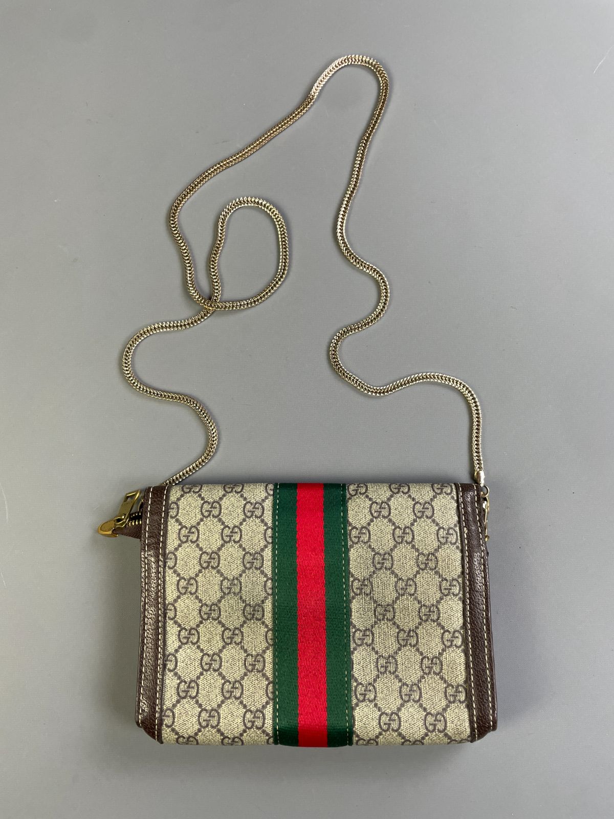 *AS-IS* GUCCI MONOGRAM PRINT FRONT STRIPE VINYL CROSSBODY BAG CHAIN STRAP