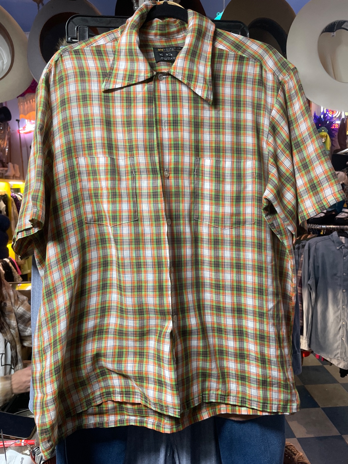 *AS-IS* PAPER THIN BOXY RETRO 1970S PLAID SHORT SLEEVE BUTTON-UP SHIRT *MISSING BUTTON