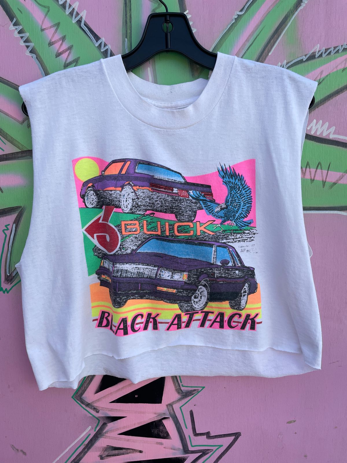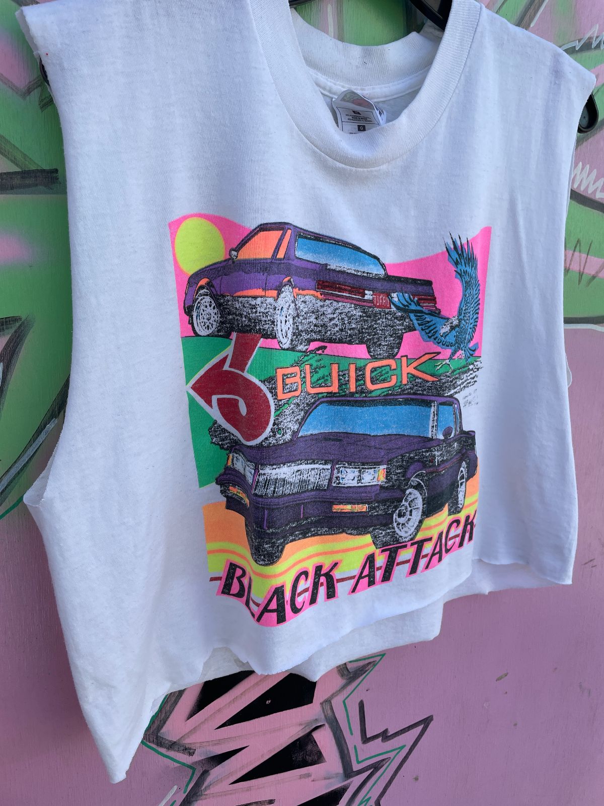 *AS-IS* RAD! DAYGLOW BUICK BLACK ATTACK GRAPHIC SLEEVELESS CROPPED T-SHIRT