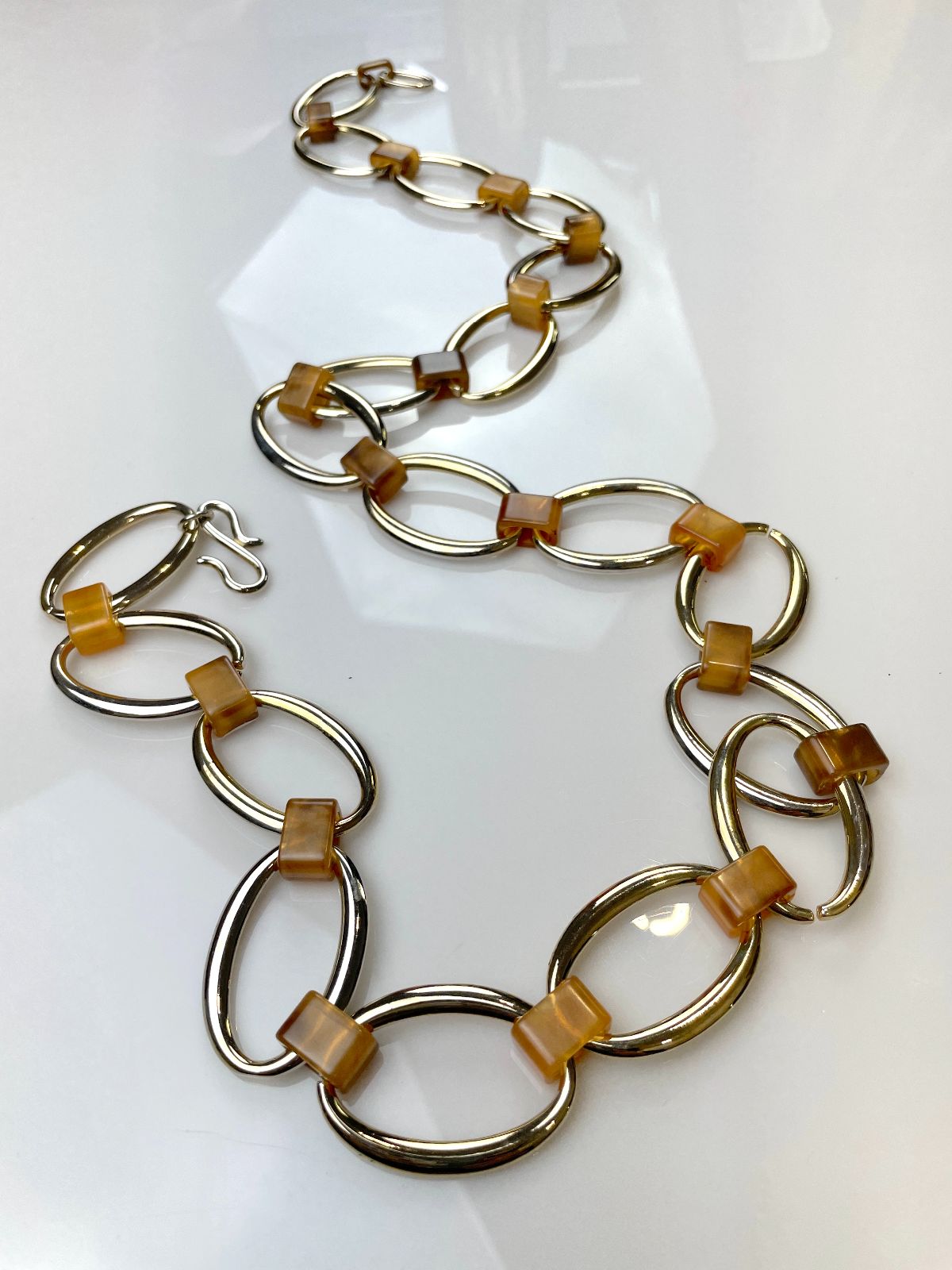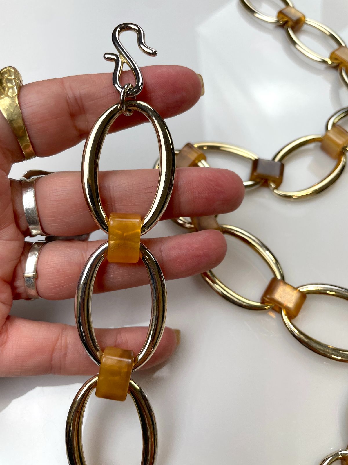 *AS-IS* RETRO HIGH POLISHED GOLD PLATED OVAL LINK BELT, IRIDESCENT ACRYLIC CONNECTORS