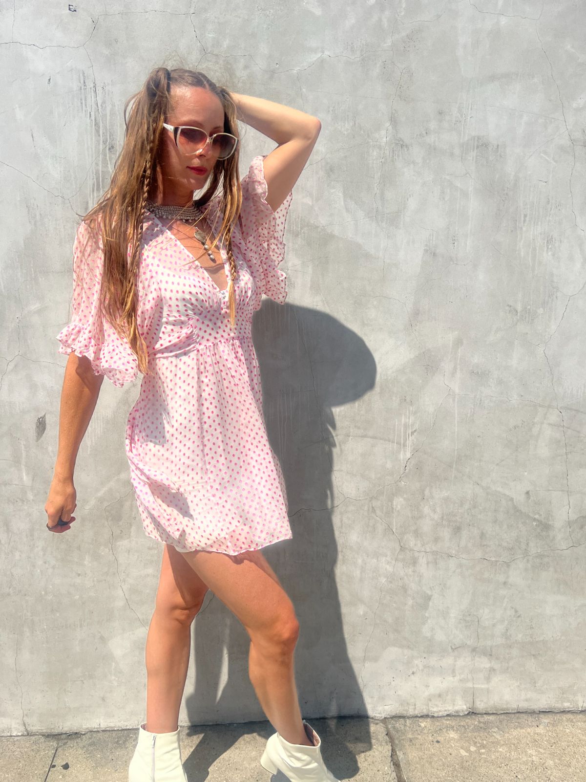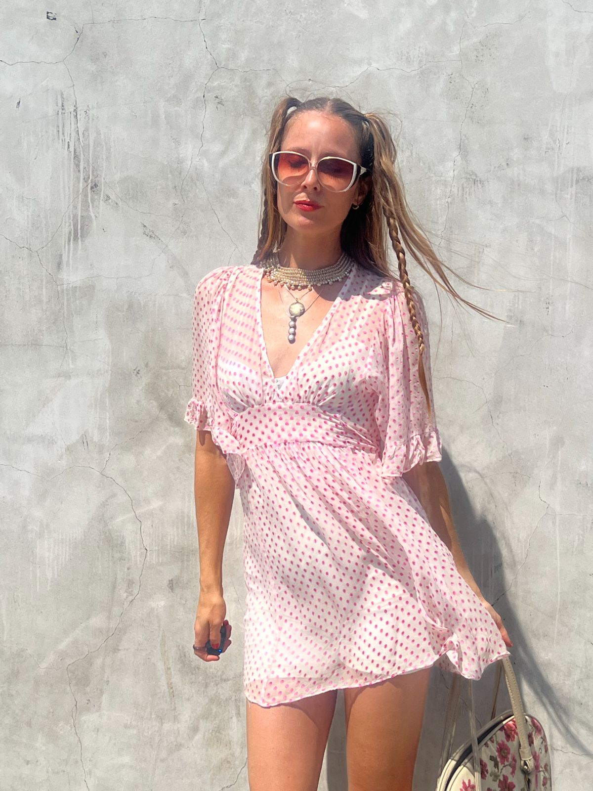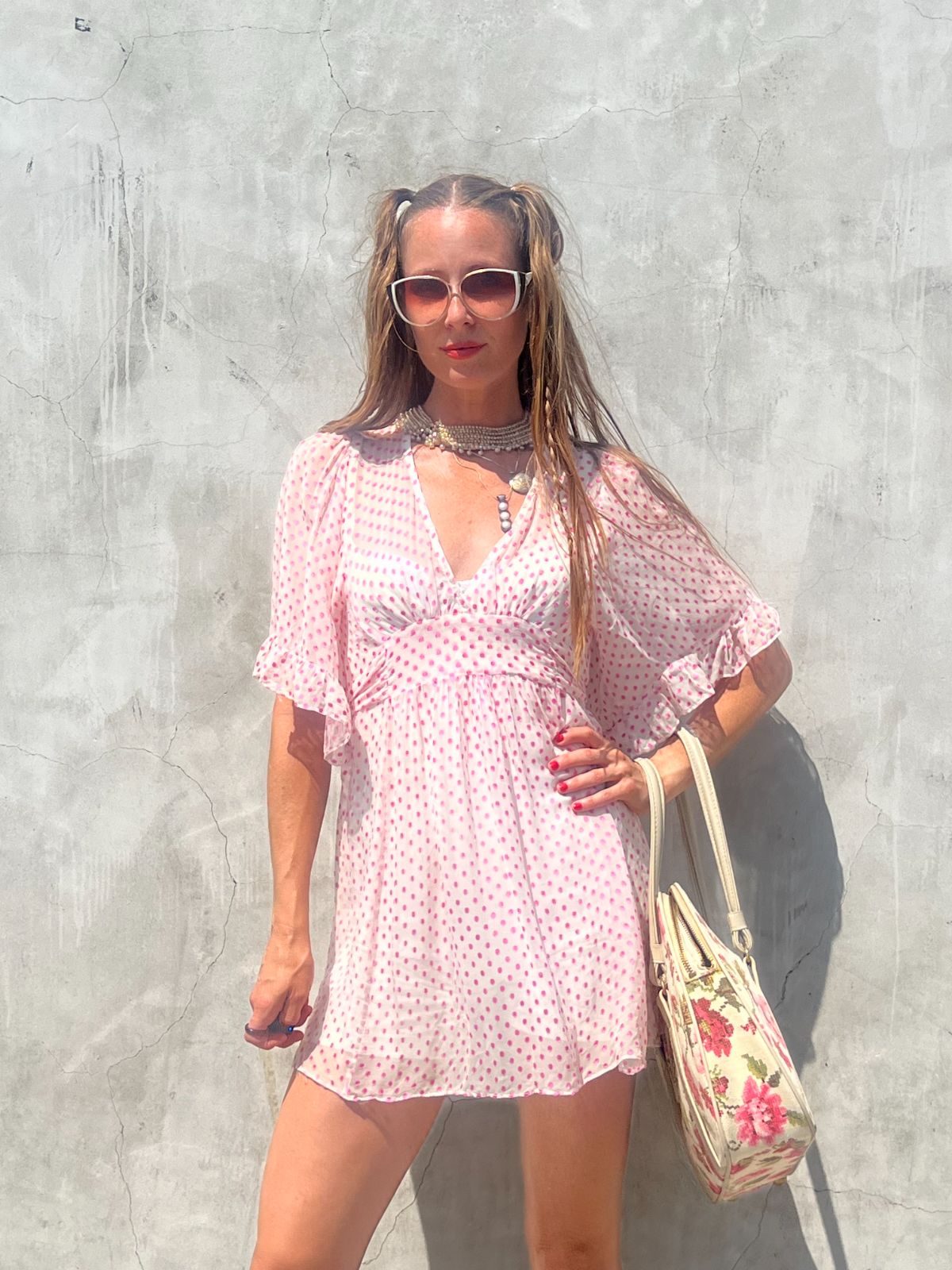 *AS-IS* SHEER 100% SILK FLOCKED POLKA DOT TUNIC BLOUSE/ MINI DRESS BILLOWING SLEEVES