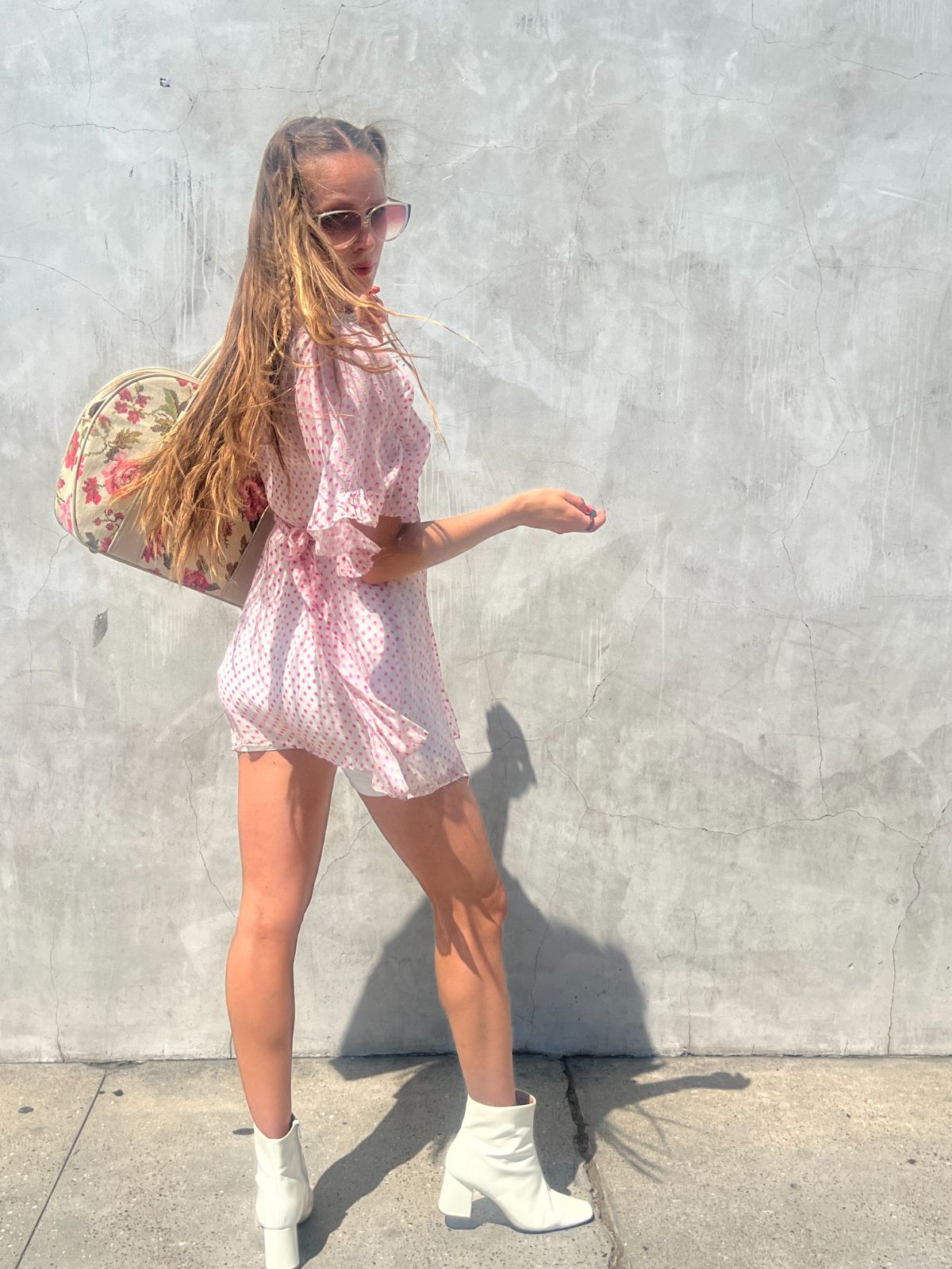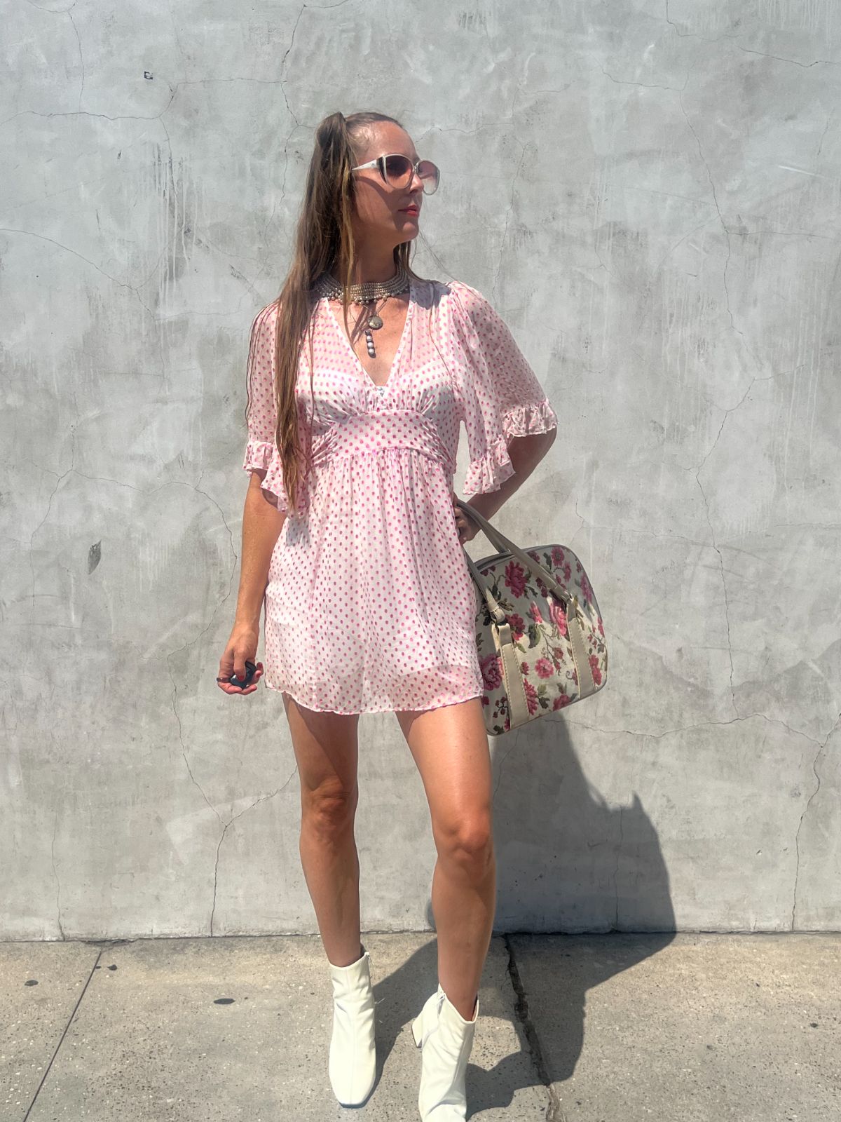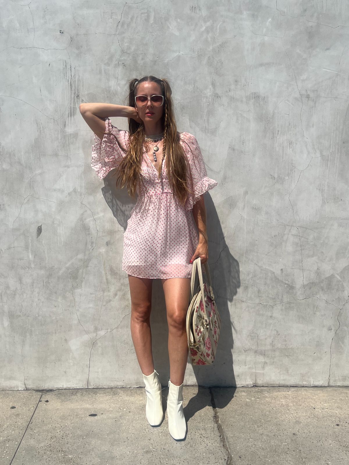 *AS-IS* SHEER 100% SILK FLOCKED POLKA DOT TUNIC BLOUSE/ MINI DRESS BILLOWING SLEEVES