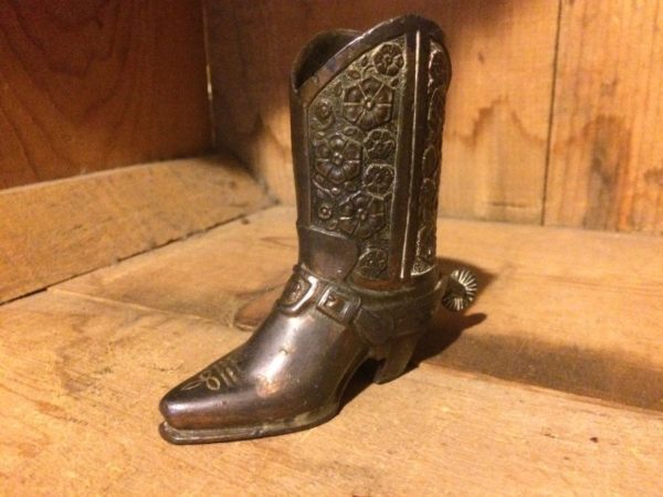 Ashtray/paperweight, Western cowboy boot with spurs, brass metal, gold