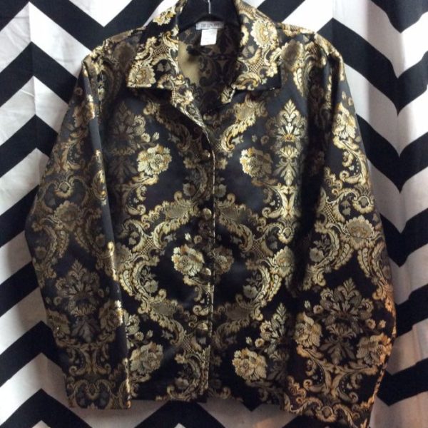 Jacket, zip-up, embroidered Asian design, black/gold, size M