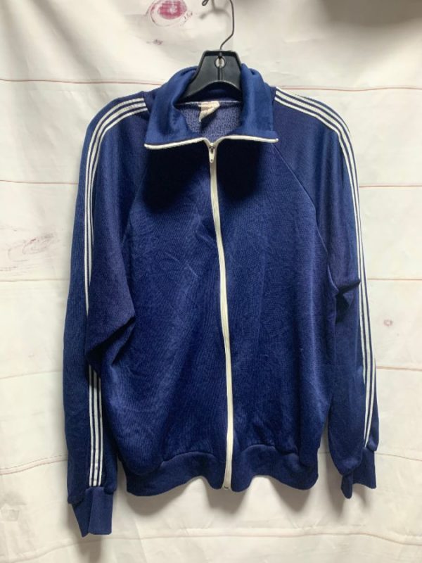 Athletic jacket, track style, zip-up, collar, ribbed knit cuffs/hem, vertical stripes down outer sleeves, blue/white, size S (blue white)