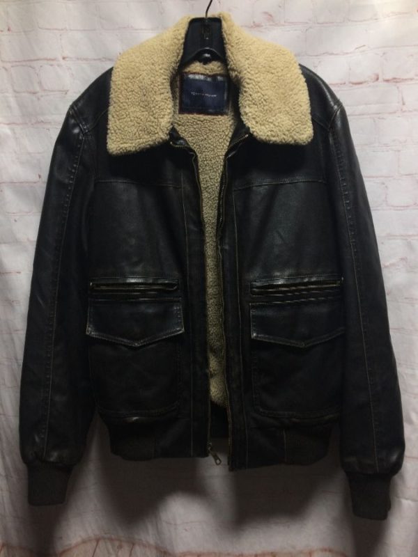 Tommy Hilfiger bomber jacket, leather, zip-up, aviator style, faux Sherpa lining, brown/creme. size M