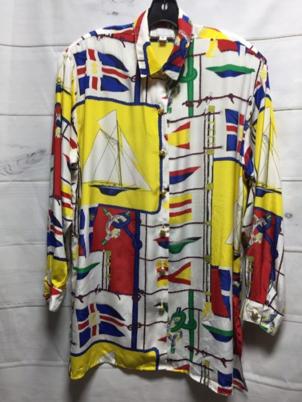 1980’s Doncaster shirt, long sleeves, button-up with gold buttons, bold colors, sailboat/boat flags print, awesome, white/yellow/blue/red/green/brown, size 10