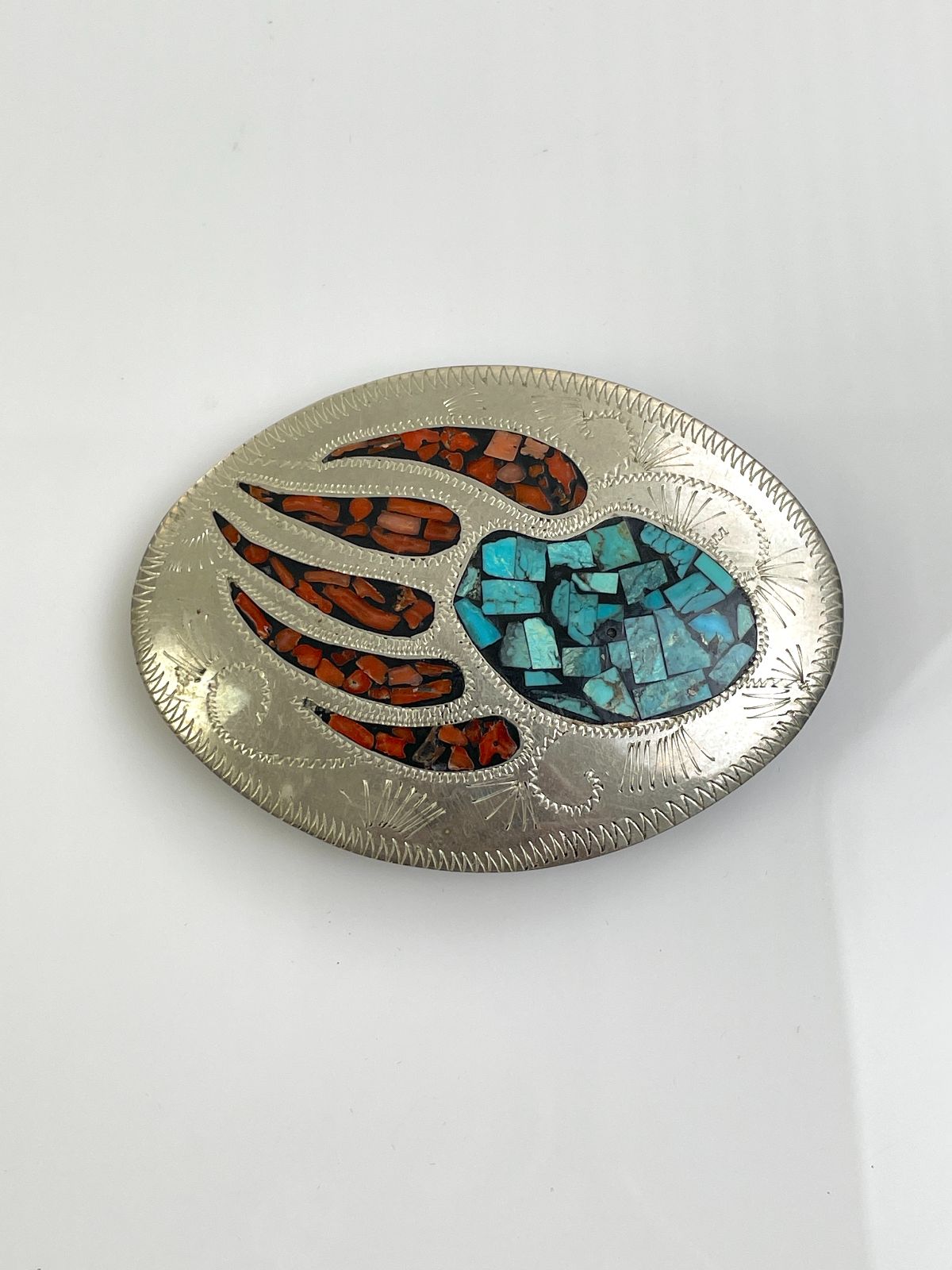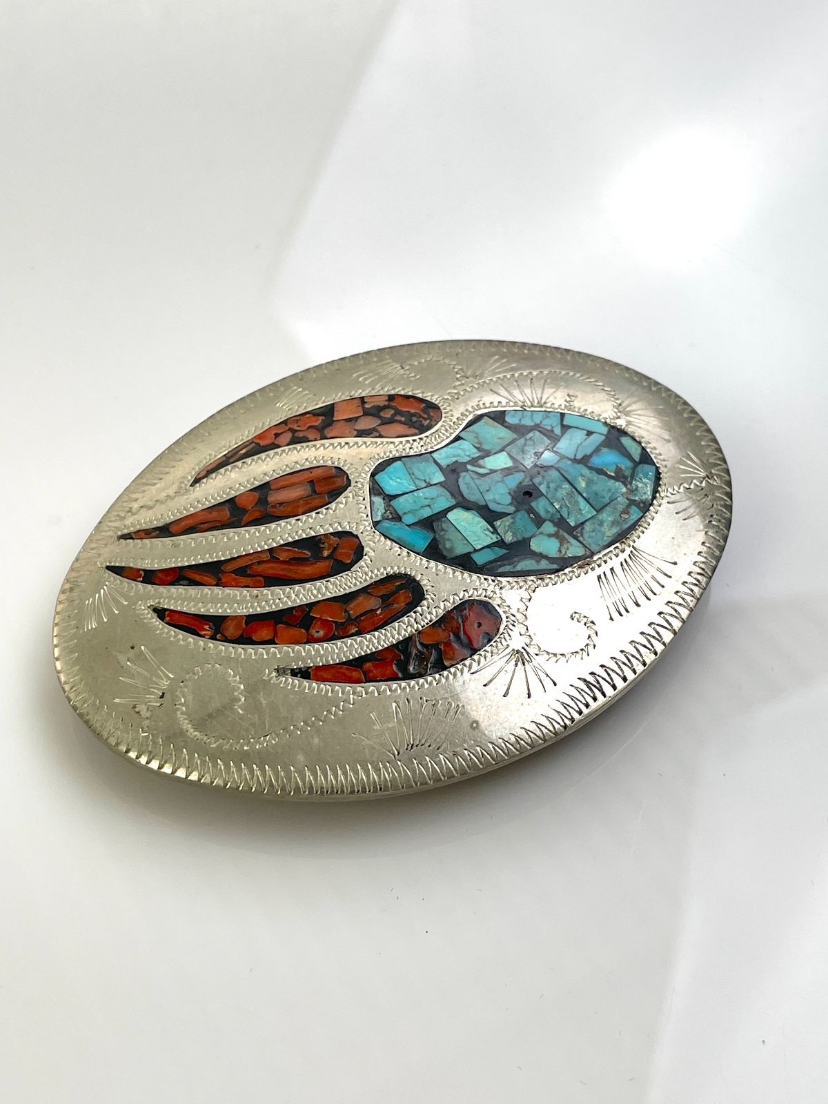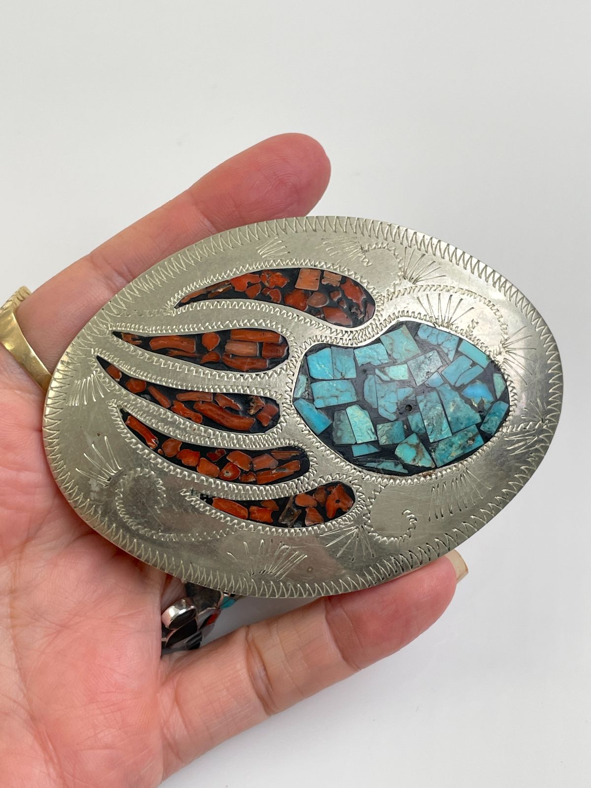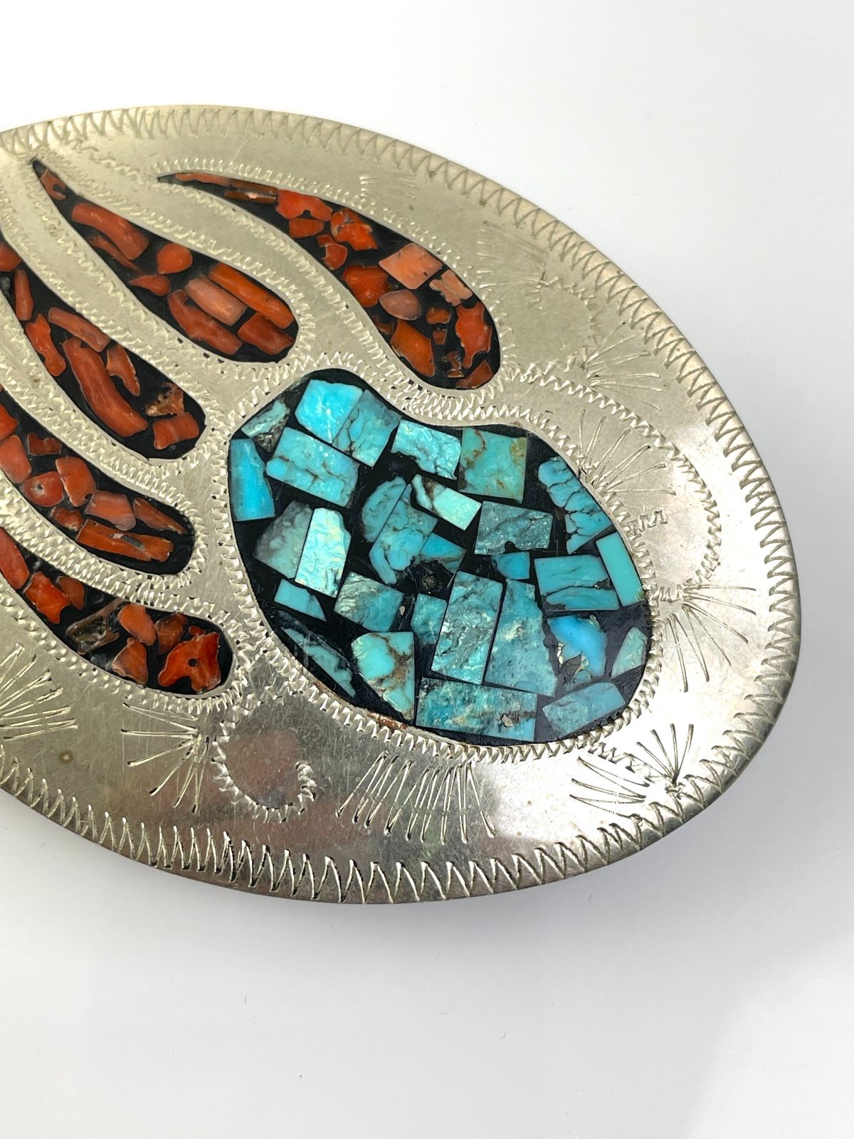 NICE! 925 STERLING SILVER ENGRAVED BEAR PAW BELT BUCKLE, CRUSHED TURQUOISE & CORAL INLAY