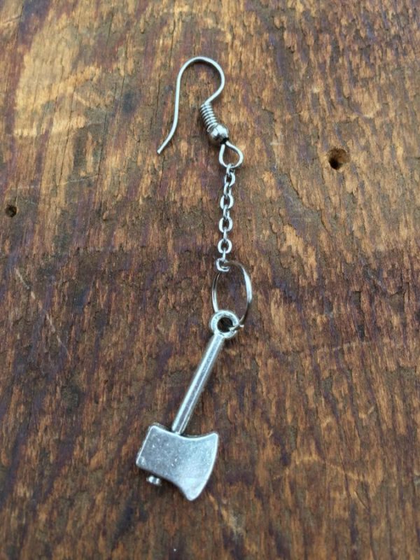 SHINY SKUNKS SINGLE EARRING, TINY SILVER COLORED METAL AXE CHARM ON CHAIN, HOOK STYLE, SILVER