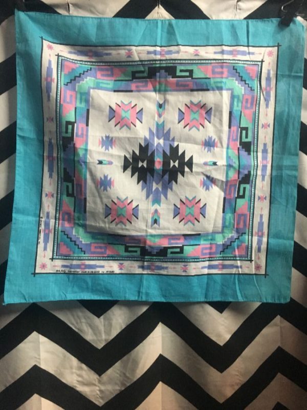 1980’s bandana, pastel colors, Aztec geometric shape print, teal/pink/black/white