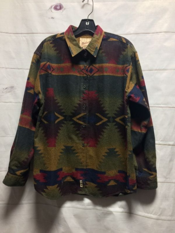 Woolrich flannel shirt/jacket, brushed cotton, long sleeves, button-up, horizontal Aztec designs, burgundy/olive green/tan/blue/purple, size L As is
