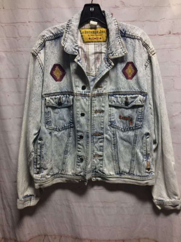 SOUTHWESTERN EMBROIDERED DESIGNS & NAVAJO LETTERING W/ ACID WASHED DENIM JACKET