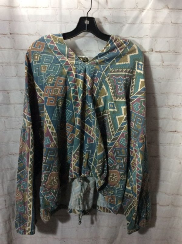 Quizz sweater, pullover, cropped, hoodie, drawstrings, Aztec print design, white/tan/purple/blue, size L