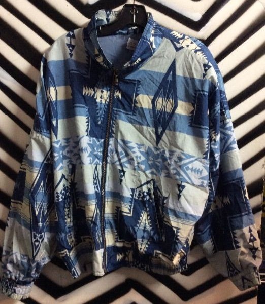 “Andy Jones” Windbreaker jacket, zip-up, blue duo-tone with Aztec print design