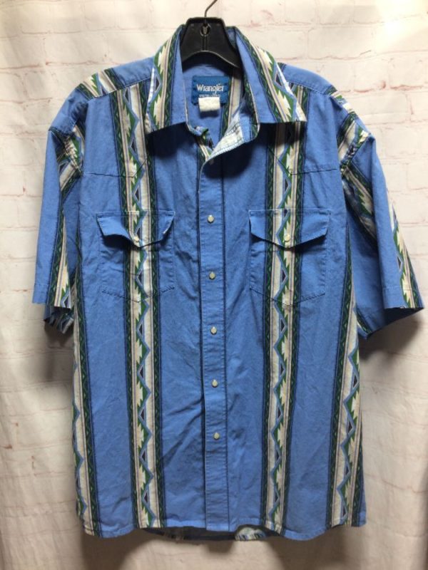 Wrangler shirt, cotton, short sleeves, button-up with pearl snaps, Aztec print in vertical striped design, 2 snap-up front pockets, blue/green/creme/beige/black, size L