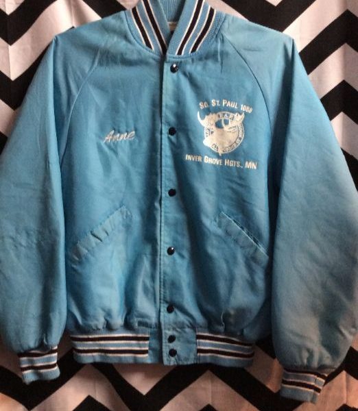 Baseball style jacket, satin, button-up, screen printed moose head logo, baby blue, size M
