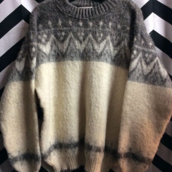 PULLOVER SWEATER, WOOL, SHAG, MOCK NECK, TRIANGLE DESIGN IN COLOR BAND ACROSS TOP AND TOP OF SLEEVES, BANDS OF COLOR ON BOTTOM, BAGGY, GRAY/CREME, SIZE L