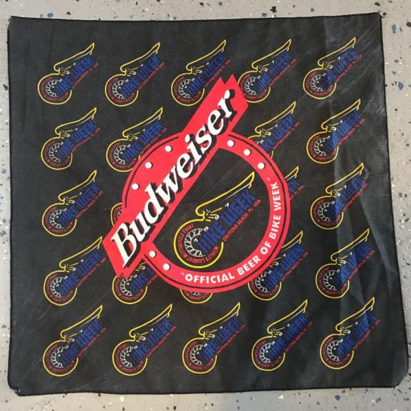 Bandana, square shape, Budweiser, Official Beer Of Bike Week, Daytona Beach – Fl. USA, World’s Largest Motorcycle Event designs, black/red/yellow/blue/white, size one size