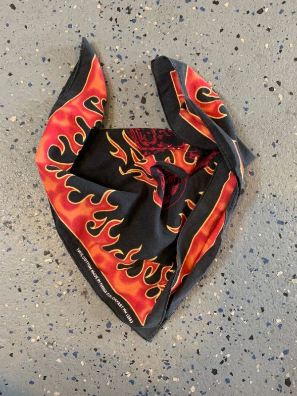 Banana, square shape, cotton, color-fast, flaming border, center design with motorcycle on fire graphic, black/orange/red, size one size