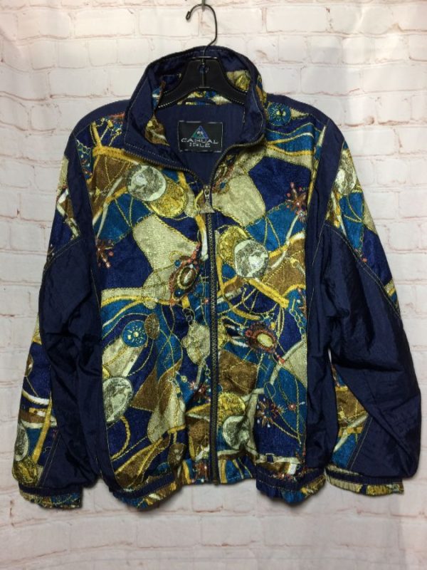 Casual Isle bomber jacket, zip-up, Baroque print with coin/rope pattern, color-block design with print & solid color, navy blue/gold/silver gray/medium blue, size L