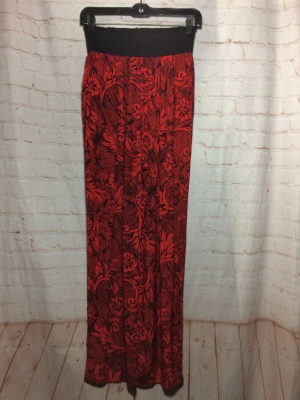 Campus Casuals pants, rayon, elastic waist, Baroque print with flower pattern, red/black, size 9-10 women’s