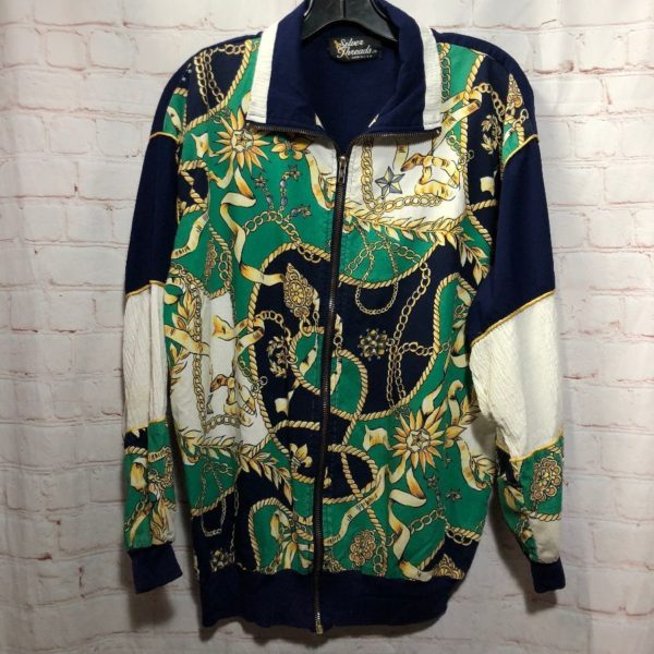 Silver Threads windbreaker jacket, zip-up, ribbed cuffs & hem, Baroque print with chains/ropes/ribbons/stars /fleur de lis designs, color block pattern, white/gold/green/navy-blue