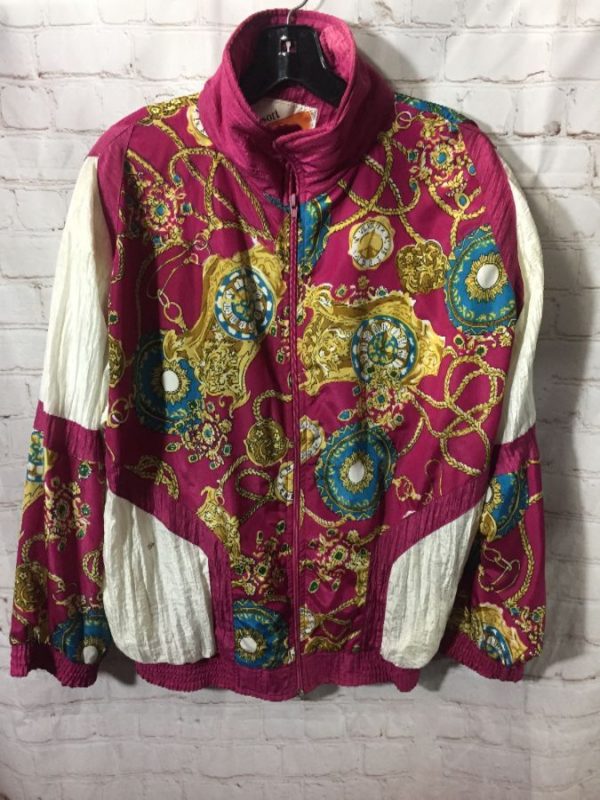 Resort Bay windbreaker jacket, zip-up, nylon/polyester, color-block with solid & Baroque designs, ropes & clocks design, white/maroon/blue/gold, size M