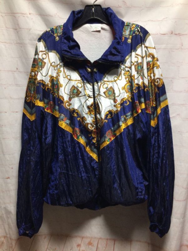 Windbreaker jacket, polyester shell & cotton lining, zip-up, Baroque design, navy blue/gold/white/red, size XL