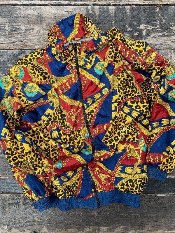 South Harbor windbreaker jacket, polyester, zip-up, Baroque design with leopard pattern, gold/blue/maroon/navy blue, size S
