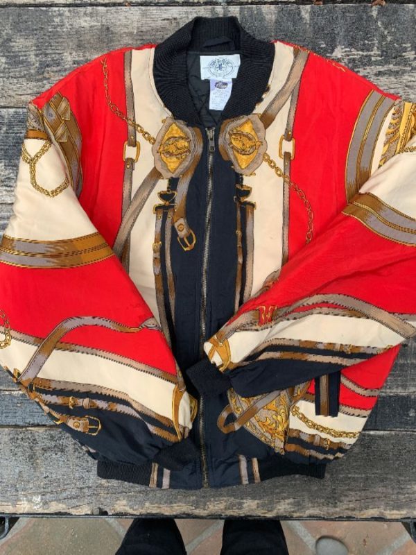 Sportific Collection bomber jacket, silk, zip-up, Baroque design with ornate equestrian print, creme/red/gold/black/gray, size L