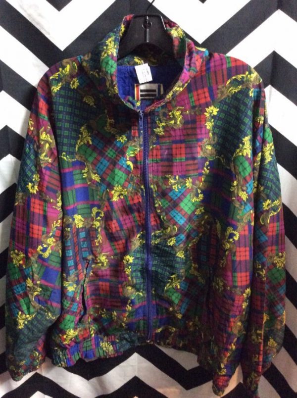 Bomber jacket, zip-up, Baroque guilded plaid design, multi/blue/green, size L