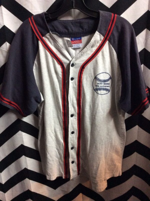 BASEBALL JERSEY COTTON BUSH LEAGUE 30TH ANNIVERSARY W/CONTRASTING SLEEVES & STRIPED TRIM