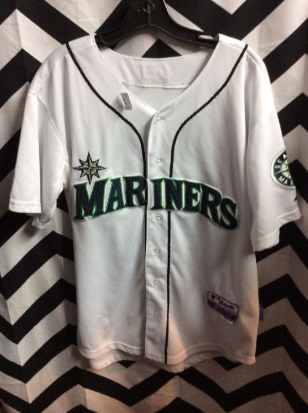 Majestic baseball jersey, short sleeves, button-up, Seattle Mariners, Griffey #24, embroidered team logos and lettering, white/navy, size 50