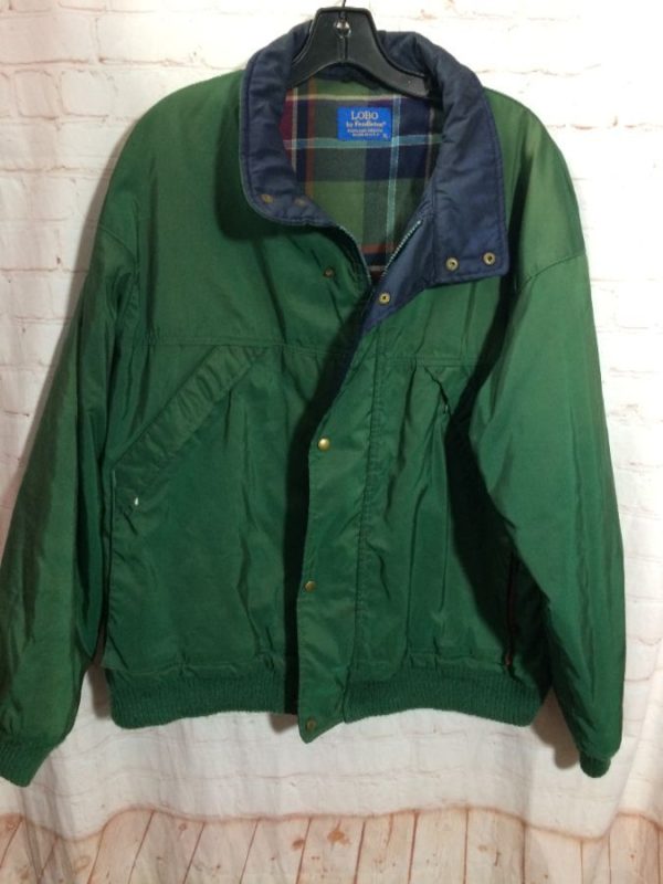 Pendleton jacket, zip-up with snaps, 3M thinsulated, plaid lining, front pockets, green/rust/white/navy blue, size XL