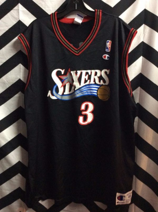 Champion basketball jersey, Sixers, Iverson #3, screen printed design full front & lettering on back, black/red/white/blue, size XL