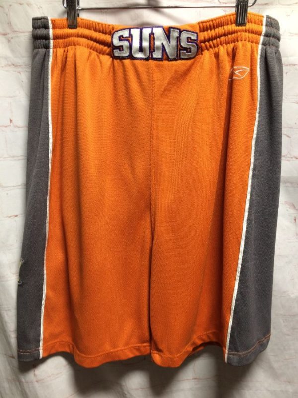 Reebok basketball shorts, polyester, elastic waist, vertical stripes down sides, Phoenix Suns, appliqued Suns & basketball patches, NBA,orange/yellow/gray/black, size 38W