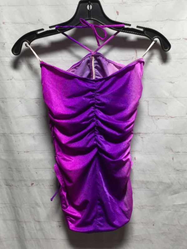 Bathing suit, halter type ties from back not front, French cut legs with drawstring adjustment, gathered down center in both front & back, vertical ombre pattern. violet/purple, size S As is