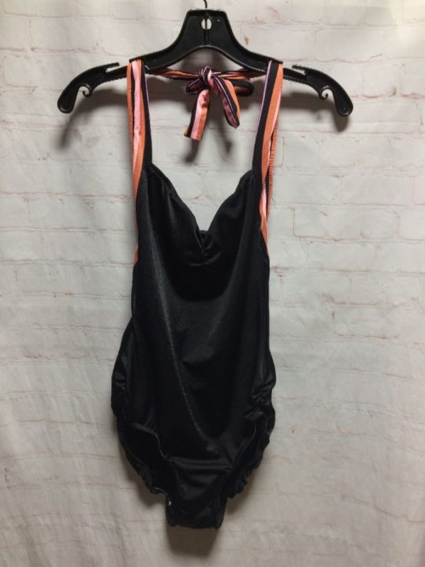 BATHING SUITS, DEEP V-NECK WITH TIE IN BACK, LOW CUT BACK, RUCHED SIDES, STRIPED STRAPS AND BACK TRIM, BLACK/PINK/BURNT ORANGE/PURPLE, SIZE 12