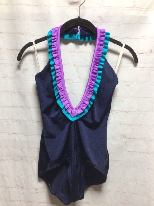 BATHING SUIT, ONE PIECE, HALTER STYLE, DEEP V-NECK WITH DOUBLE RUFFLED EDGE TRIM, NAVY BLUE/TURQUOISE/PURPLE