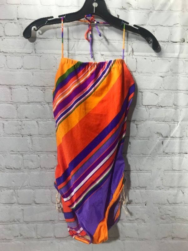 Bathing suit, one piece with halter style tie, bright multi-colored diagonal striped design, adjustable sides, orange/purple/white/blue/green, size 12/S. As is