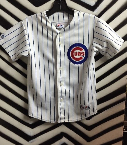 Cubs #25 Lee, baseball jersey, short sleeve button-up, pinstriped design, white with blue pinstripes, size S