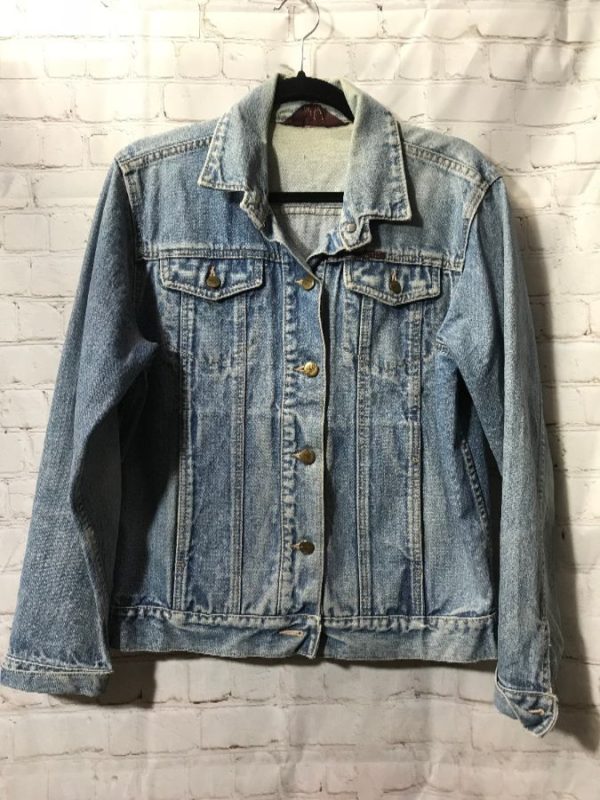 Mizz Lizz denim jacket, button-up, 4 front pockets, acid wash, medium blue, size L as is