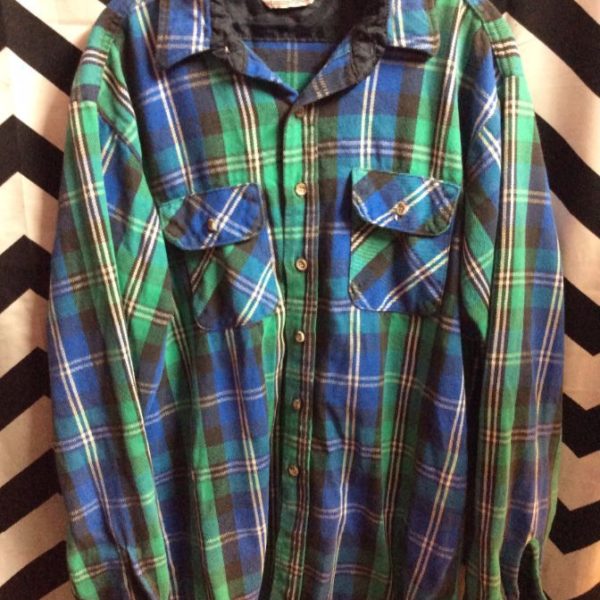Flannel shirt, cotton, long sleeve, button-up, front pockets, plaid pattern, blue/green/black/white, size XL