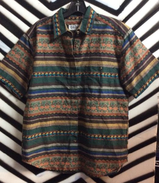 Woven shirt with ethnic print design, short sleeve button-up, brown/green multi-color, size M
