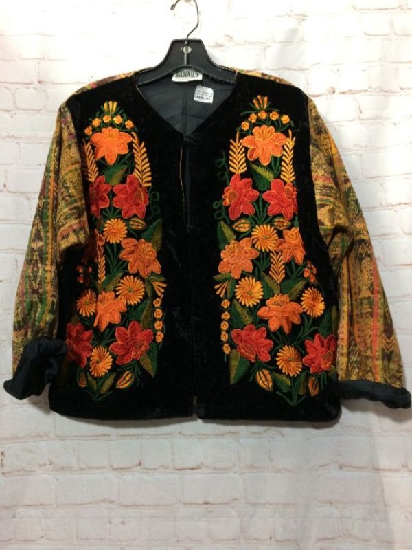 VELVET FLORAL FRONT DESIGN JACKET W/ WOVEN SLEEVES & BACK