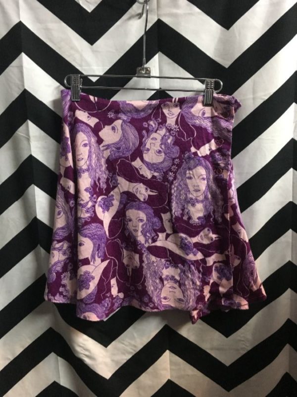 WRAP SKIRT W/ GIRL FACES & FLOWERS PRINT