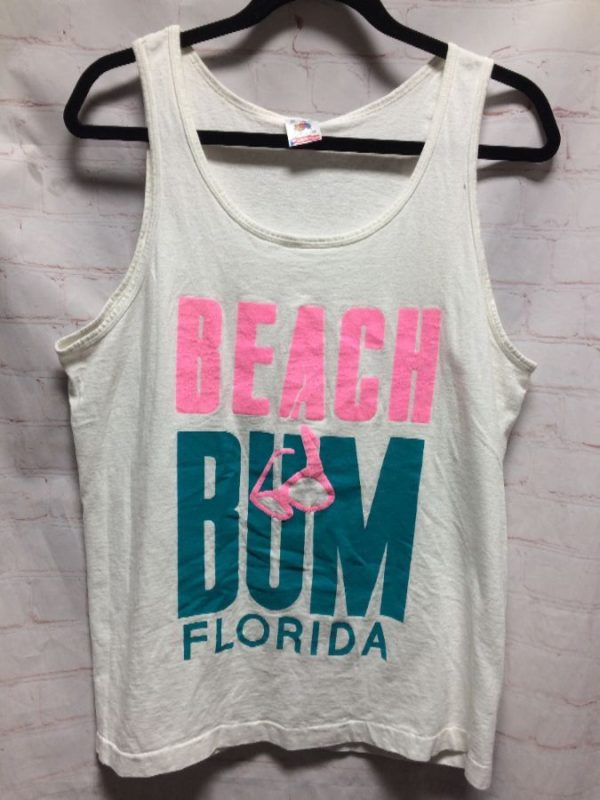 Tank top, cotton, Beach Bum Florida, screen printed front lettering & sunglasses graphic, white/pink/teal, size M As is