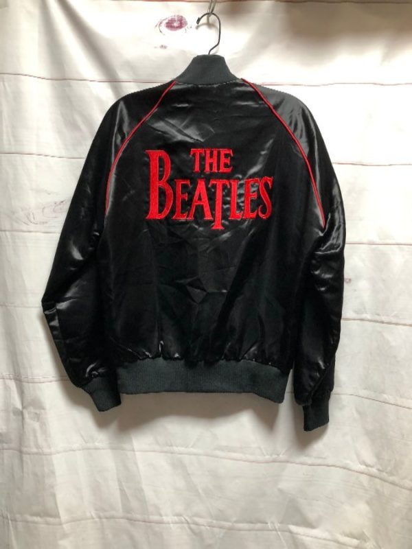 California sports jacket, acetate satin, button-up with snaps, lined, knit collar/cuffs/hem, piping sleeve accent trim, The Beatles, embroidered band name, black/red, size S (black red)