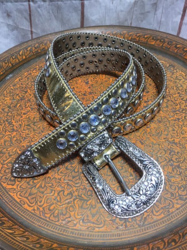 Belt, shiny metallic color, studded along outer edge, bejeweled down middle section, ornate metal buckle, gold/silver/ice blue, size L