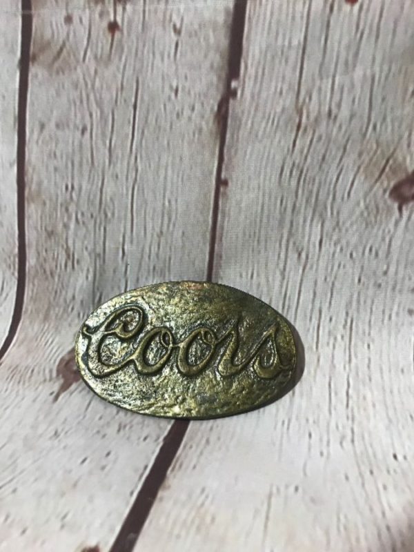 COORS BELT BUCKLE, OVAL SHAPE, LOGO WITH HAMMERED FINISH, METAL, BRASS